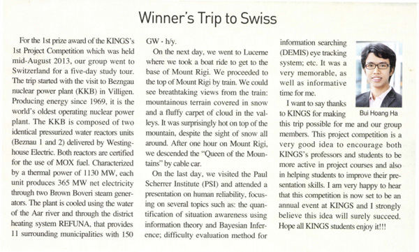 Tôi muốn gửi lời cảm ơn đến trường KINGS đã tài trợ và tạo điều kiện để chúng tôi có thể thực hiện chuyến đi này. Cuộc thi là một ý tưởng hay nhằm khuyến khích các giáo sư và sinh viên của KINGS chủ động hơn trong các khóa học dự án và giúp sinh viên nâng cao khả năng thuyết trình. Tôi rất vui khi biết rằng cuộc thi này hiện trở thành một sự kiện hàng năm tại KINGS và tôi thực sự tin rằng ý tưởng về cuộc thi sẽ chắc chắn thành công và được tất cả sinh viên của KINGS hưởng ứng.