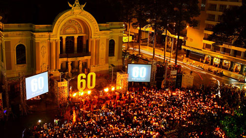 Người dân TP.HCM cùng thắp nến tắt điện vào Giờ Trái Đất năm 2012 tại Nhà hát lớn.