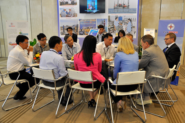 Ông Nguyễn Cường Lâm (áo trắng – giữa), (Phó tổng giám đốc EVN, trưởng ban  quản lý dự án điện hạt nhân Ninh Thuân cùng đối tác Rosatom và PECC2 trao đổi công việc tại gian triển lãm của PECC2