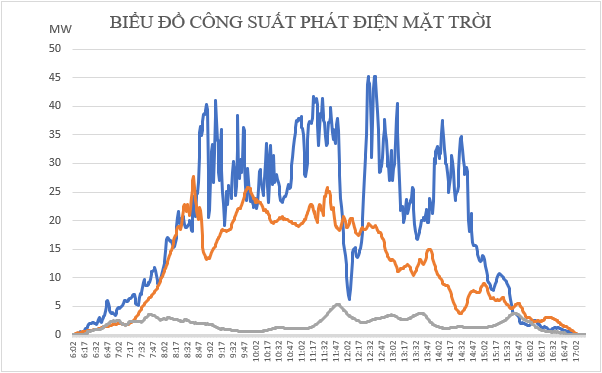 Công suất phát điện mặt trời tùy thuộc hoàn toàn vào điều kiện thời tiết, có những ngày phát công suất cao, nhưng cũng có những ngày phát công suất khá thấp. Bên cạnh đó, công suất điện mặt trời thường xuyên dao động và có nhiều thời điểm thay đổi đột ngột, như được thể hiện ở hình trên. Trên đường màu xanh, có thời điểm điện mặt trời giảm 35% trong vòng 5 phút, và giảm 80% trong vòng 15 phút.