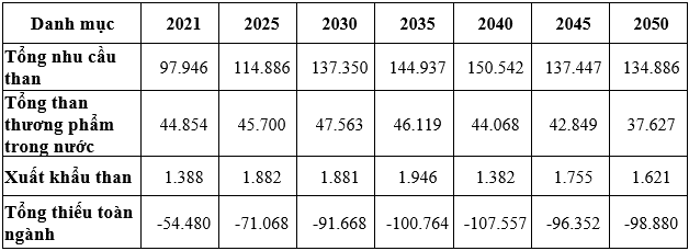 Theo Quy hoạch tổng thể về năng lượng quốc gia do Viện Năng lượng lập, sản lượng than thương phẩm trong nước hàng năm đến 2050 tối đa khoảng 50 triệu tấn/năm, thấp hơn lượng than đã nhập khẩu năm 2020 và không đủ đáp ứng nhu cầu trong nước. Cũng theo quy hoạch trên, Việt Nam cần phải nhập khẩu lượng than khá lớn, cao nhất đến hơn 100 triệu tấn/ năm để đáp ứng nhu cầu trong nước.