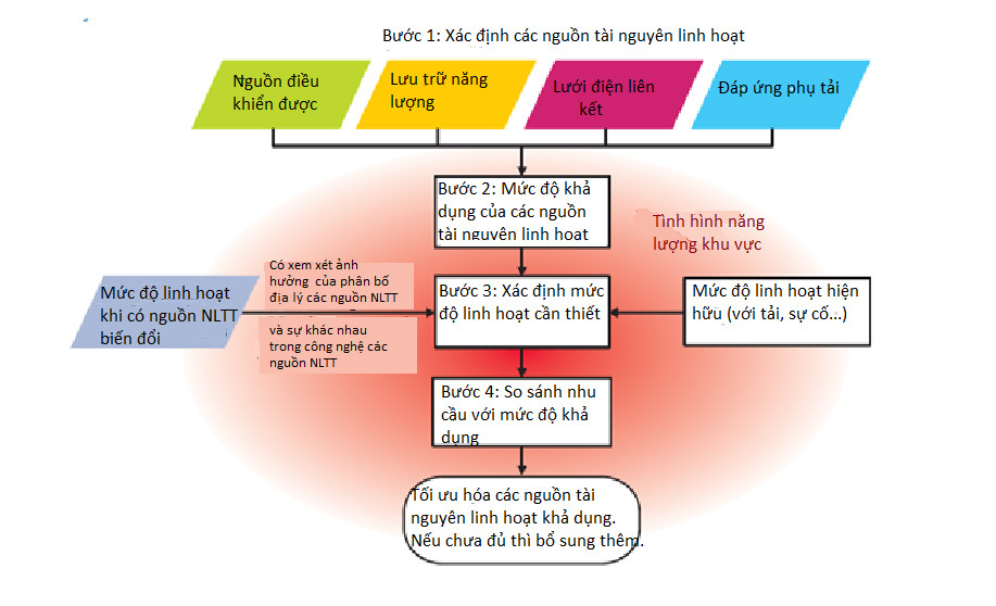 Theo phương pháp này, trong việc đánh giá khả năng đáp ứng nhu cầu cân bằng với các nguồn PV nói riêng cũng như các nguồn năng lượng tái tạo biến thiên nói chung, có 4 nhóm tài nguyên cần được xem xét khả năng thay đổi linh hoạt, gồm: Các nguồn điện linh hoạt điều khiển được, trong đó có các nguồn có có tốc độ đáp ứng nhanh; Các hệ thống lưu trữ năng lượng, trong đó có các hệ thống đáp ứng (nạp/xả) nhanh; Các lưới điện liên kết (nếu có); Đáp ứng của phụ tải.