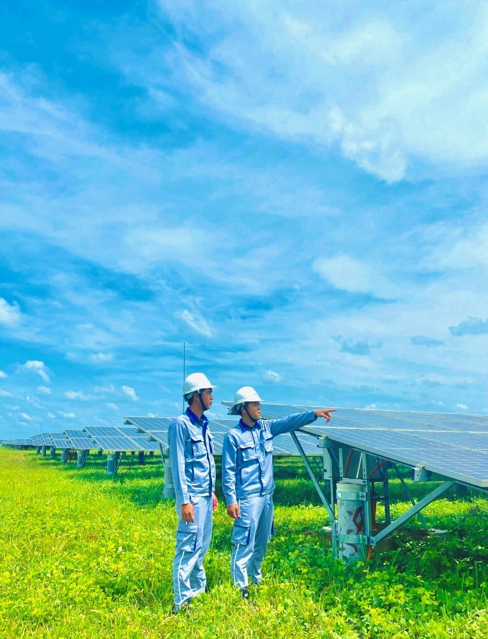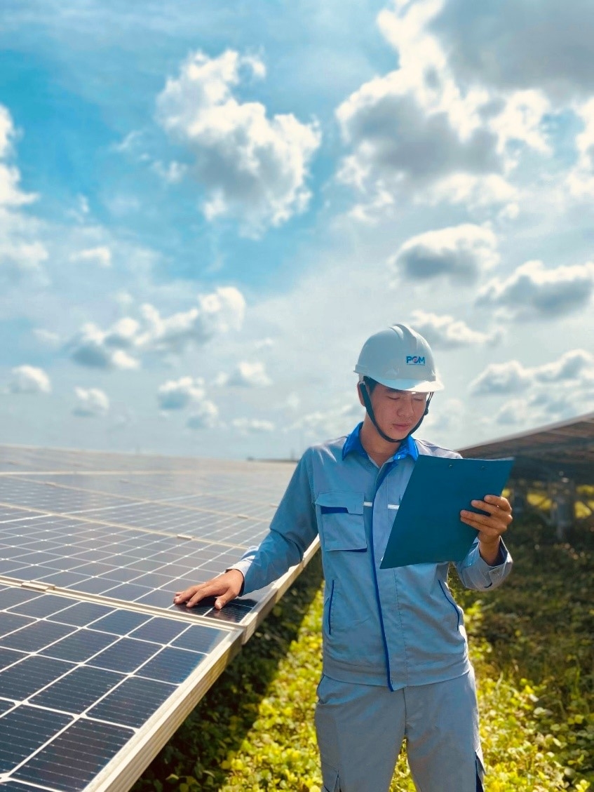 Vận hành viên POM thực hiện công tác kiểm tra tấm pin.