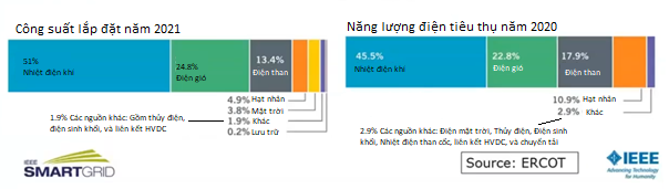Hình 1: Tỉ trọng công suất và sản lượng nguồn điện ở Texas (3)