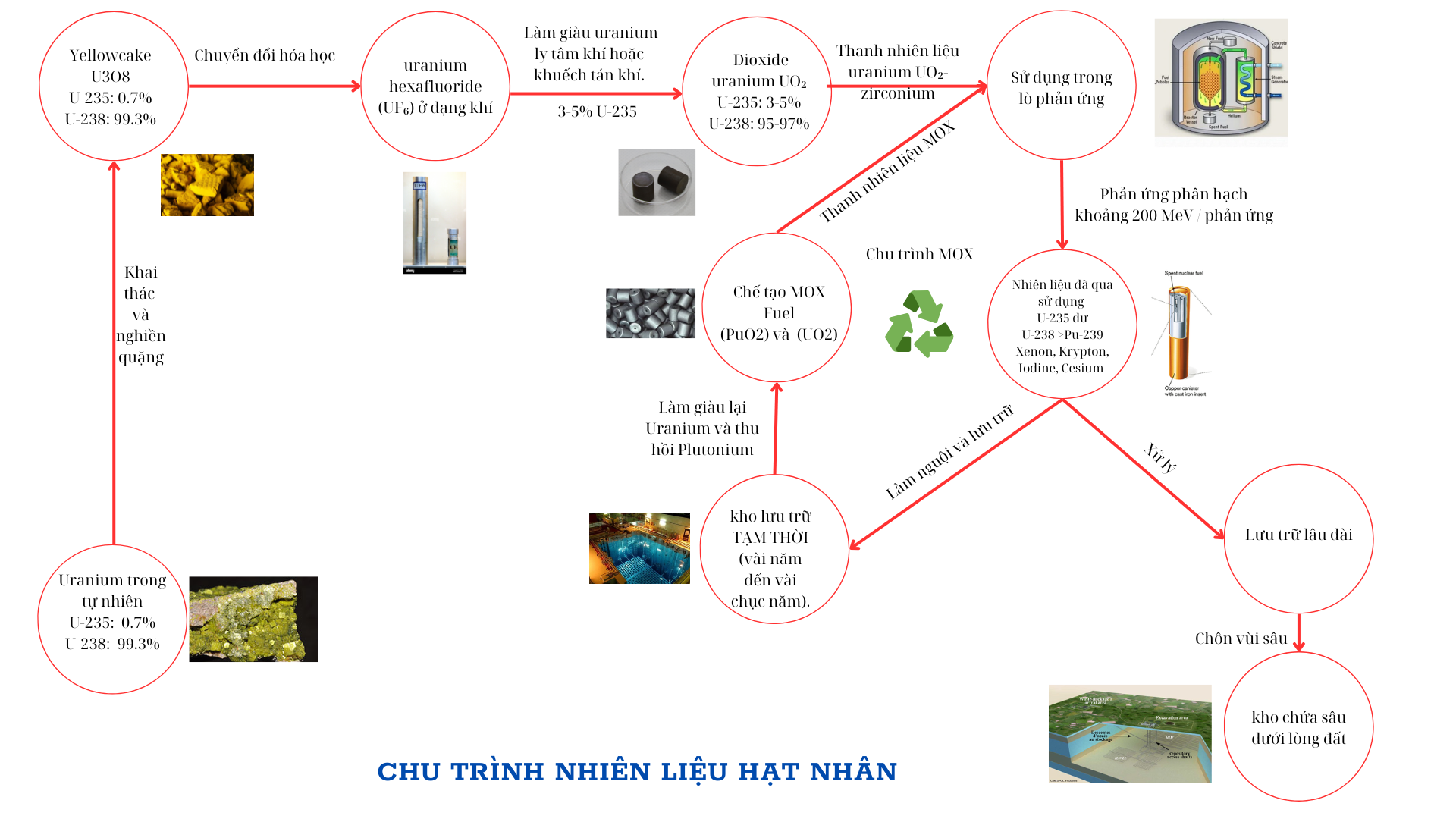 Chu trình nhiên liệu hạt nhân bắt đầu từ khai thác quặng uranium, sau đó trải qua các giai đoạn chuyển đổi, làm giàu, chế tạo nhiên liệu, sử dụng trong lò phản ứng, và cuối cùng là xử lý nhiên liệu đã qua sử dụng.