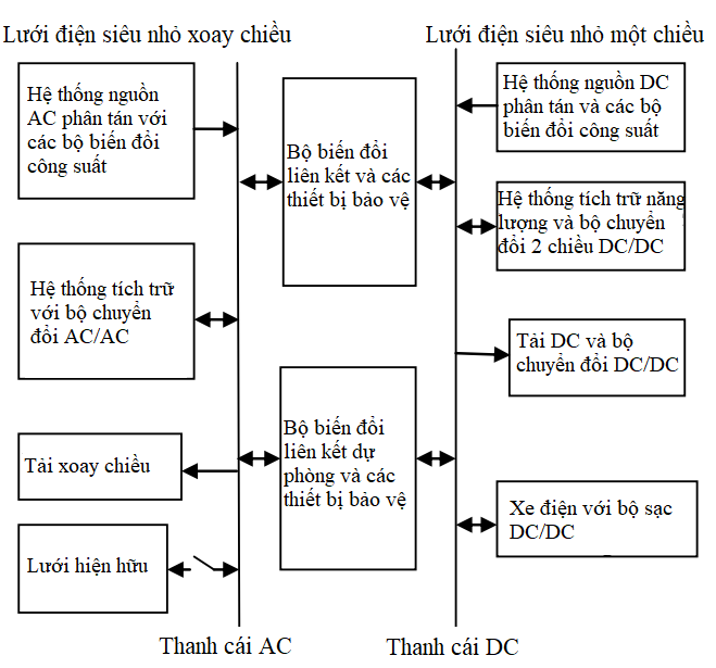 Trong đó, lưới điện siêu nhỏ xoay chiều được kết nối với lưới điện siêu nhỏ một chiều thông qua bộ biến đổi liên kết và các thiết bị bảo vệ. Bộ biến đổi liên kết này có chức năng đảm bảo sao cho hệ thống hoạt động tốt, phù hợp với yêu cầu điều khiển trao đổi công suất giữa thanh cái AC và DC, đảm bảo giá trị điện áp và tần số tại điểm kết nối chung nằm trong ngưỡng cho phép.