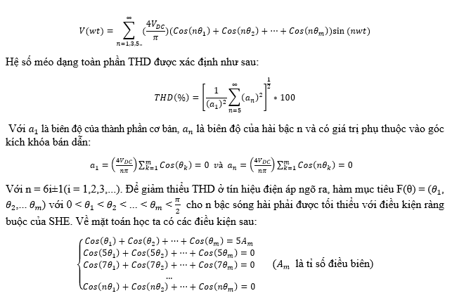 Các kỹ thuật loại bỏ sóng hài chọn lọc SHE sử dụng các góc kích khóa bán dẫn tối ưu để tạo ra giá trị điện áp và phổ sóng hài mong muốn. Trước khi áp dụng các kỹ thuật SHE, cần hiểu về liên hệ giữa góc kích khóa bán dẫn và hệ số méo dạng toàn phần (Total harmonic ditortion: THD). Gọi