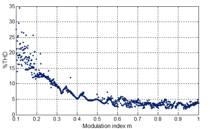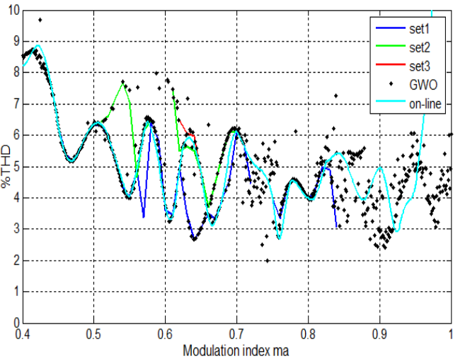 Với bộ nghịch lưu 15 bậc, sóng hài có giá trị nhỏ hơn 10% ứng với các giá trị tỉ số điều biên thay đổi từ 0.3 đến 1. Các phương pháp truyền thống khó tiếp cận được lời giải khi độ phức tạp của bài toán tăng lên cùng với sộ bậc của bộ nghịch lưu, trong khi GWO dễ dàng cho kết quả tối ưu chỉ với vài thay đổi nhỏ của tham số.